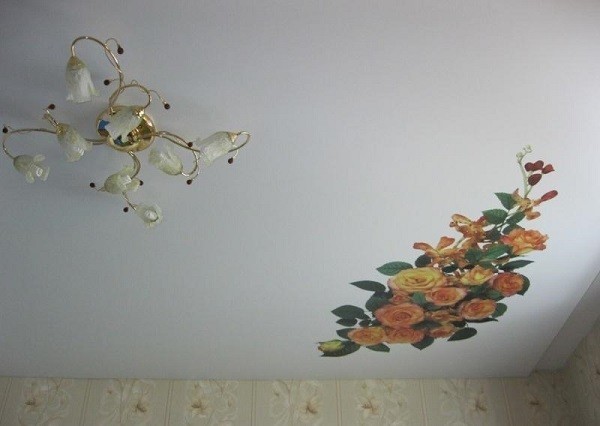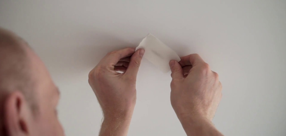Les sections rapiécées le long du mur et dans les coins resteront invisibles, mais si vous deviez coudre au centre du plafond, vous pouvez également utiliser de la peinture acrylique pour le masquage. Il est appliqué avec un flacon pulvérisateur sur le site des dommages. Ainsi, il est possible d'atteindre un état d'apparence idéal.