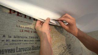 - Si le dommage se situe près d'un mur, la toile peut être beaucoup étirée. Cette méthode convient lorsqu'il n'y a pas plus de 15 cm du trou au mur, le défaut est caché dans une baguette. Pour ce faire, vous devez en retirer un morceau de revêtement dans une petite zone. Coupez les dégâts avec des ciseaux. En conséquence, vous obtiendrez un nouveau bord, vous devez y attacher un cordon, envelopper le film et le glisser dans la baguette. Cela nécessitera l'utilisation d'une truelle arrondie et d'un sèche-cheveux ou d'un pistolet thermique pour aider à augmenter l'élasticité du matériau. Si l'espace est éloigné du mur, cette méthode ne doit pas être utilisée et le film ne doit pas être trop serré. De ce fait, le plafond se détériorera complètement. Même chauffer le tissu avant de commencer le travail n'aidera pas ici.