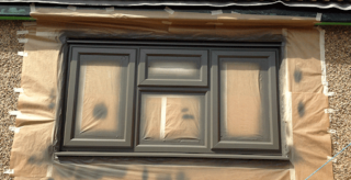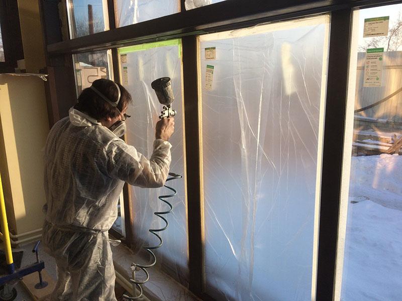 - Si l'application des matériaux de peinture a lieu sur place, il est nécessaire de sceller les joints avec du ruban adhésif, le verre est protégé avec une pellicule plastique ou du carton. De plus, les pentes et le rebord de la fenêtre sont recouverts de peinture.