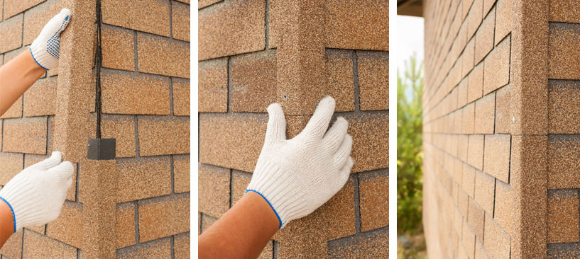 - Chaque rangée est décalée d'un demi-pétale. Cette action ferme les attaches avec du matériel, la paroi avant imite le matériau naturel. Grâce aux encoches préfabriquées par le fabricant aux extrémités des bardeaux, il est facile d'aligner la position. Les empattements peuvent s'accrocher aux surfaces verticales, ce qui facilite l'installation du toit seul. C'est ainsi que toutes les surfaces de façade planes s'adaptent.