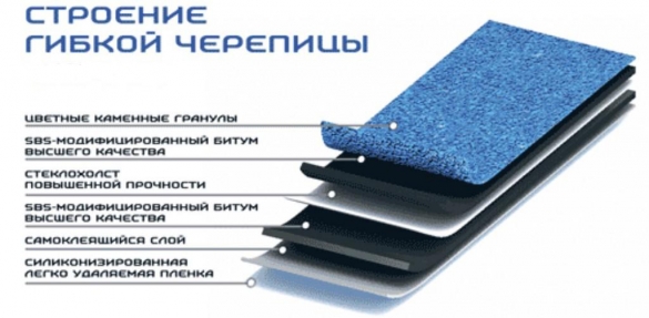 Structurellement, le revêtement se compose d'une base dense, enduite des deux côtés de substances polymères ou bitumineuses liantes. Une couche de gravillons, de sable ou de film de polyéthylène est appliquée sur la partie supérieure des bandes, ce qui protège le matériau de la contamination et des dommages mécaniques.