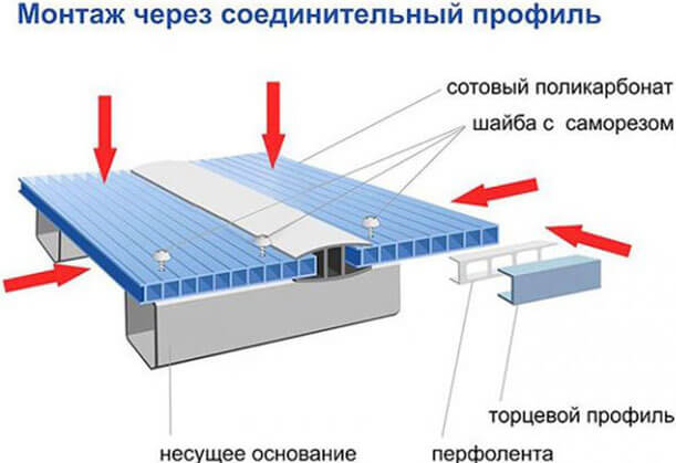 - Pose des dalles, pose et fixation de leurs extrémités dans des profilés. Perçage de trous dans le polycarbonate avec élimination accidentelle des copeaux du nid d'abeilles. Les puits doivent être 3 à 4 mm plus larges que le diamètre de la tige autotaraudeuse. La distance entre eux est prise dans les 30-40 cm.