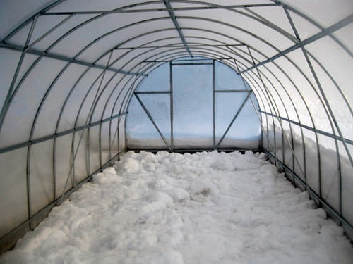Le sol restant est creusé à l'intérieur, saupoudré d'une solution de permanganate de potassium, de sorte qu'avec le réchauffement du printemps, les microbes et bactéries nocifs ne pénètrent pas dans la serre. En hiver, dans les régions froides de la Russie, des vents forts et des blizzards sont observés. Par conséquent, à l'automne, ils contrôlent l'intégrité et l'état des clôtures et des toits. Si les structures ne sont pas renforcées, la neige et le vent endommageront la finition et rendront la serre inutilisable.