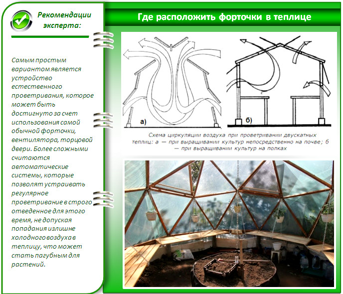 Un certain nombre de traverses sont nécessaires pour que la ventilation en hiver soit réussie. Pour ce faire, pour 2 mètres courants, les parois de la serre prévoient une ouverture d'ouverture. Il est préférable de les placer en damier des deux côtés.