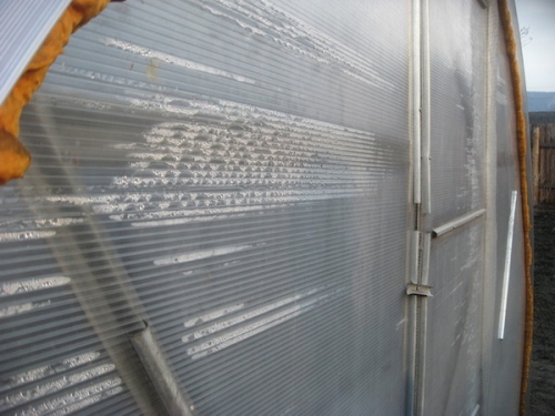 Les gouttelettes d'eau sur les murs de la serre commencent à se dilater lors du gel, de sorte que la couche supérieure de bois, de polycarbonate, se fissure. Si la serre est fermée, il y aura plus de telles particules d'eau et le risque de destruction augmentera.