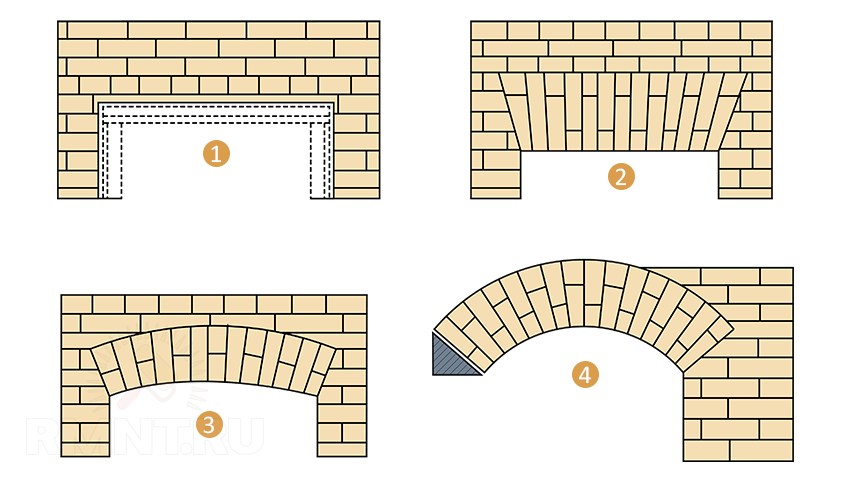 - Les blocs de briques sont coupés de manière à ce que, après la pose, leurs bords dépassent de la maçonnerie verticale précédemment posée sur les côtés de l'ouverture.