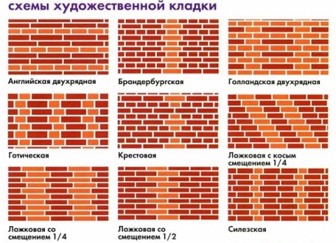 Selon le type de placement des briques, il existe des schémas de pose: gothique, croix, hollandais, chaîne, cuillère dans une demi-brique. Il existe d'autres options pour le montage des éléments.
