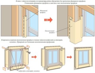 Parfois, la garniture est faite autour de la fenêtre, qui affleure le mur extérieur et n'a pas de pentes profondes. Dans ce cas, une structure sur une caisse ressemblant à des plateaux est réalisée à partir de bardage. Les bandes de départ et de fin sont fixées au cadre à partir du rail. Celui de départ est placé dans la partie inférieure sous la fenêtre, et celui de finition est monté en haut et des deux côtés.