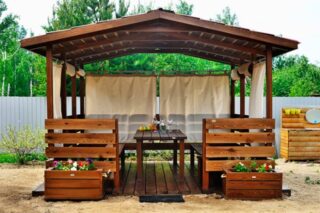La construction d'un gazebo avec un toit en pente est une option simple qui ne nécessite pas de connaissances et de compétences spécifiques. Si vous rencontrez des difficultés, contactez une entreprise de construction ou un contremaître. La préparation au travail évite les erreurs et les augmentations de budget.