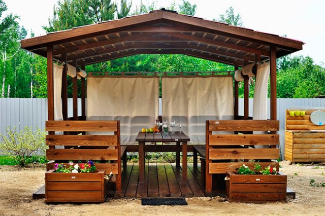 Même un débutant avec peu d'expérience en construction peut gérer la construction d'un belvédère de conception simple. La géométrie de l'espace intérieur vous permet d'installer un brasero, une table à manger et un canapé. Les facteurs suivants sont en faveur du choix d'une structure avec un toit en pente :