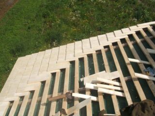 Le système de chevrons de toit est composé de planches bordées. Aux endroits de contact avec le béton ou la brique (le cas échéant), une imperméabilisation à deux couches est posée. Il doit être perméable à la vapeur pour empêcher le bois de pourrir en raison de l'accumulation de condensation.