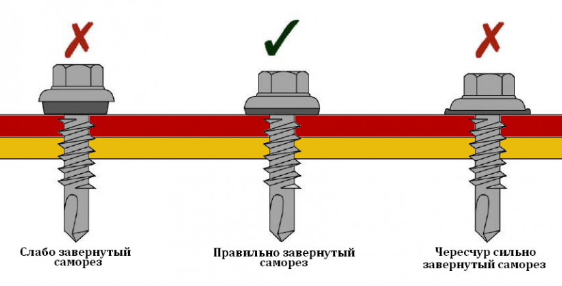 - La fixation du carton ondulé est réalisée 4 jours après le coulage des piliers. Cela permet à la solution de durcir complètement. La tôle profilée est fixée le long de chaque vague avec des vis autotaraudeuses avec une rondelle en caoutchouc.