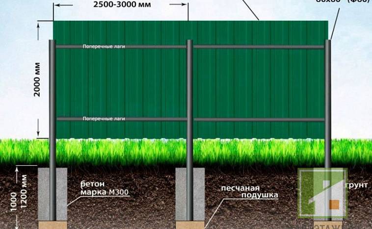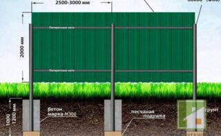 Pour un type rectangulaire, un écart de 2-3 mètres est pris, pour un diamètre rond - 2-2,5 m Plus le poids de la structure est important, moins la distance est parcourue. Les clôtures en filet et en carton ondulé signifient la longueur entre les éléments ~ 5 mètres.