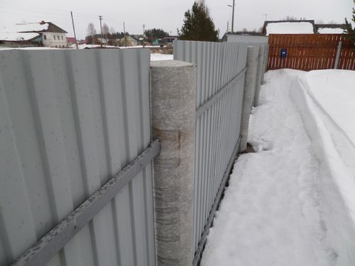 Les supports sont achetés ou fabriqués indépendamment. Dans ce dernier cas, il est nécessaire d'assembler un cadre en bois, de le remplir de béton et de renfort. Par conséquent, la meilleure option pour une clôture à partir d'une tôle profilée consiste à utiliser des poteaux prêts à l'emploi.