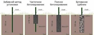 Il existe deux modes de bétonnage : complet et partiel. Dans le premier cas, j'ai mis un coussin de sable et de gravier au fond de la fosse, sur lequel un pilier est installé. Il s'ensuit le bétonnage. Avec une méthode partielle, un poteau de 50 à 60 cm est enfoncé dans le sol et le reste est bétonné.