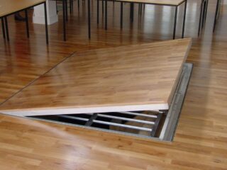 Il est facile de monter la trappe sur un pont en bois. Une ouverture est préalablement découpée en dessous. Lors du travail, il est important de maintenir la hauteur pour que le vantail et la couche de finition soient au même niveau.