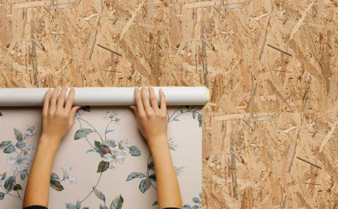 - Papier peint - il est préférable de prendre des dalles non polies pour une telle finition. La surface poncée est très lisse, le papier peint intissé lourd ne s'y accrochera pas. Tous les matériaux peuvent être collés, car l'OSB a une très faible perméabilité à la vapeur.