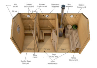 Le dispositif d'un bain avec un hammam suppose le respect des normes de hauteur. Le paramètre ne va pas au-delà de 2,1 à 2,4 mètres pour assurer un chauffage de haute qualité de l'espace interne. La largeur est prévue en fonction du nombre d'étagères et de leur emplacement. Il peut y avoir un poêle dans le hammam, ou il est sorti dans le vestiaire. Si l'appareil de chauffage est situé dans le hammam, cela doit être pris en compte lors de l'élaboration du plan de la pièce.