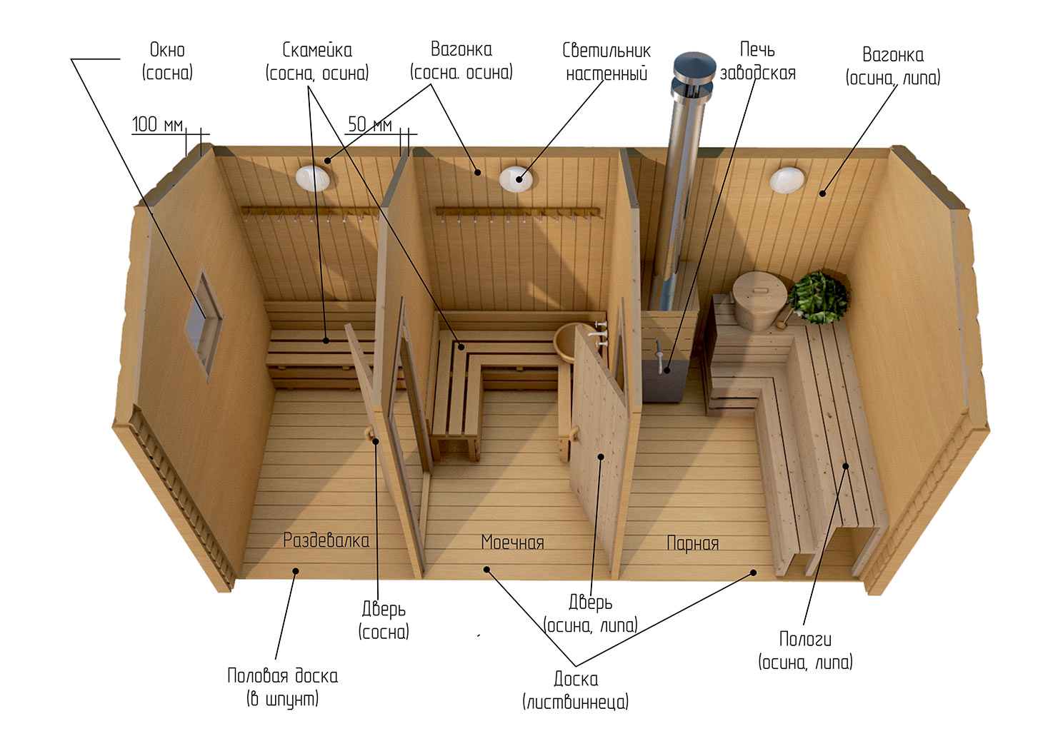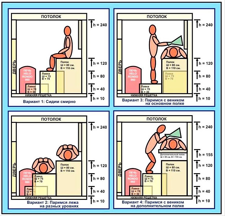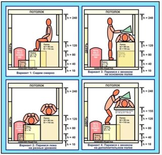 Le premier niveau des étagères est placé à 40-50 cm du sol. Les bancs pour s'asseoir ont une largeur de 60 cm, et un couchage confortable est assuré par une largeur de 91 cm.La longueur des étagères est prévue à partir de 1,5 mètre et plus afin que vous puissiez vous dégourdir les jambes. Dans le sauna, les sièges mesurent 50 cm de large.