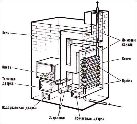 Le four en briques avec chauffe-eau est une modification de l'appareil de type standard. La structure elle-même reste la même, mais un conteneur et des tuyaux y sont ajoutés, à travers lesquels le liquide de refroidissement s'écoule. Il s'agit généralement d'eau, mais dans les bâtiments visités périodiquement, de l'antigel est versé. Grâce à cela, pas une n'est chauffée, mais toutes les pièces dans lesquelles le circuit est amené.