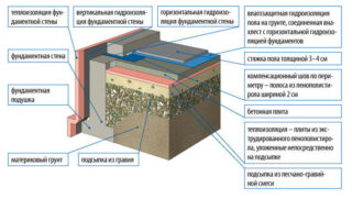 Pour cette option, une tranchée de 30 à 50 cm de profondeur est creusée dans la fondation, recouverte de sable et de pierre concassée, et ce mélange est compacté au fond. Dans la plupart des cas, cette zone est déjà la première couche du sous-plancher. En cas de nappe phréatique élevée, il est recommandé de poser une imperméabilisation sur la couche de sable et de pierre concassée et de disposer une deuxième couche de pierre fine et de sable de rivière. Au lieu de cela, vous pouvez faire une chape brute en béton.