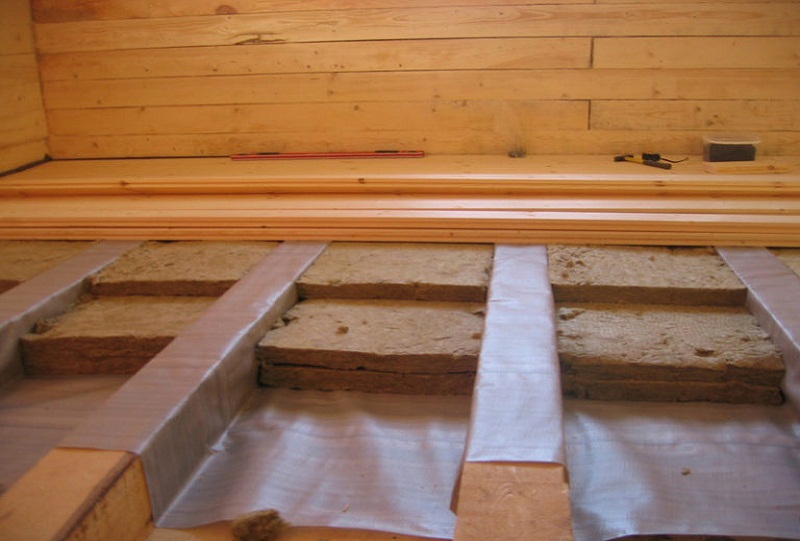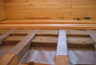 - Si les décalages sont cousus par le bas, des cavités restent entre les poutres, dans lesquelles l'isolant est posé. Si le revêtement de sol est placé sur le dessus, une caisse est placée sur l'imperméabilisation et des plaques de mousse plastique, des tapis de laine minérale sont placés dans les cellules résultantes, de l'argile expansée est coulée.