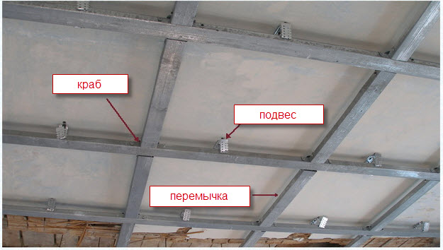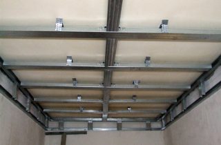 - Faire un cadre. Pour les pièces étroites jusqu'à 100 cm de large, des bandes de périmètre sont suffisantes. Dans les grandes pièces, il est nécessaire de réaliser des cavaliers porteurs transversaux, en utilisant des suspensions verticales pour leur fixation.