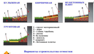 En l'absence de protection des fondations de la maison contre les effets de l'humidité, vous ne devez pas commencer à améliorer le bâtiment de l'intérieur. Dans le cas général, le problème est résolu par la construction d'une bordure de protection (zone aveugle) sur tout le périmètre de la structure érigée. Structurellement, il s'agit d'une bande de béton imperméable adjacente au sous-sol de la maison, qui assure le drainage de l'eau en raison de la pente dirigée loin de la maison. La finition décorative de la zone aveugle a gagné en popularité, pour laquelle divers types de carreaux, de pavés et d'autres matériaux sont utilisés. Dans le même temps, une telle bordure, en plus de son objectif principal, vous permet d'équiper une piste belle et confortable.