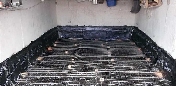 Les matériaux de film et de membrane ne conviennent pas à la chape de garage, car ils ne sont pas assez élastiques et ne tolèrent pas mal les effets saisonniers des eaux souterraines. On utilise généralement une isolation en rouleau - un matériau de toiture bitumineux ou une isolation en hydroglass.Tout d'abord, du mastic bitumineux est appliqué en couche mince sur la surface et les joints avec les murs sont recouverts d'un ruban en caoutchouc qui ne laisse pas passer l'eau. L'étanchéité enroulable est montée sur le dessus. Il doit reposer à plat, sans bosses. Les morceaux de matériau sont posés avec un chevauchement avec un chevauchement de 0,2 mètre. Au-dessus d'une couche d'isolant en rouleau, créez-en une autre similaire.