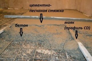 Les balises sont utilisées pour contrôler l'uniformité de la surface. Ils sont constitués de profilés métalliques ou de tuyaux d'un diamètre de 25 à 30 mm. Les phares sont fixés au sol avec du béton épais à une distance de 1,5 à 2 m les uns des autres. Ils peuvent être traités à l'huile machine pour faciliter le démontage ultérieur.
