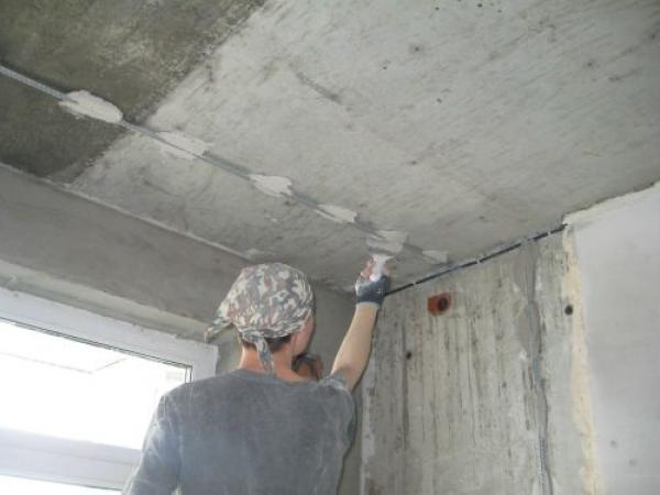 Au plafond, le plâtre est appliqué après avoir collé un treillis en plastique ou en métal, en particulier aux endroits où la couche dépasse 1,5 cm.Pour la couche de finition, de l'albâtre ou de la craie est ajouté à la solution de sable et de ciment afin que la solution adhère à la surface et est pratique à lancer.