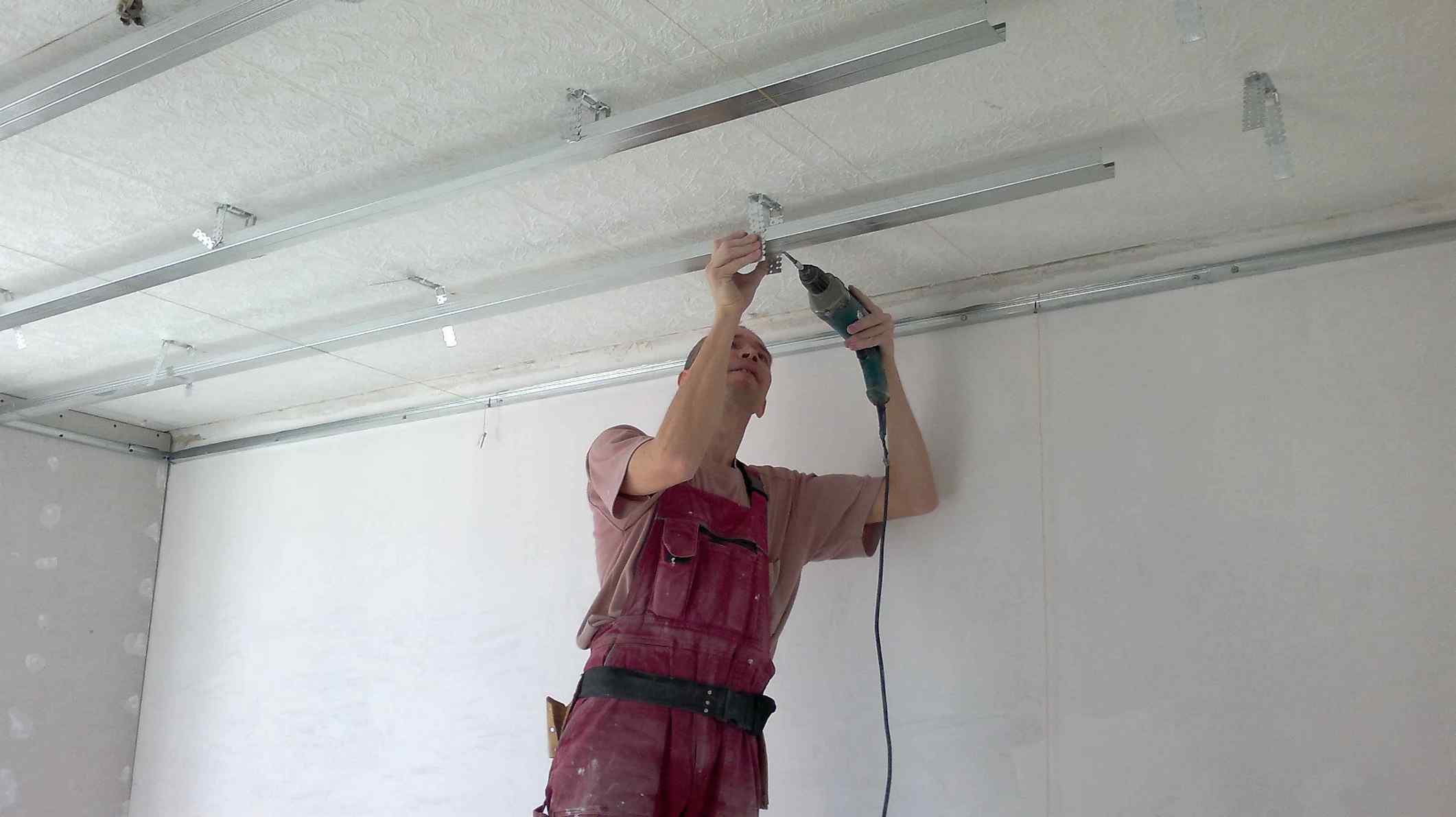 Les supports sont fixés au plafond avec une cheville en plastique avec une vis autotaraudeuse et les pièces métalliques sont reliées à l'aide de vis anti-puces. Le couvercle g/carton est fixé avec des vis autotaraudeuses pour métal de taille 40 mm avec fil fin, plastique ou bardage est fixé avec des « altises » ou tiré avec des agrafes d'une agrafeuse.