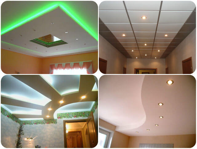 Les plafonds à un niveau sont plâtrés, plâtrés, recouverts d'éléments de finition sur une base en béton armé. Les multi-niveaux sont une version à cadre dans laquelle ils cachent le câblage, la ventilation et d'autres communications, de telles structures prennent la hauteur de la pièce.