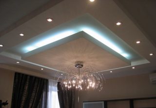 Le niveau en saillie est placé sur toute la zone, réalisé sous la forme d'un îlot avec éclairage ou placé autour du périmètre de la pièce. La structure latérale de la couche abaissée est ouverte et fermée. Dans la première version, un éclairage à ruban est placé.