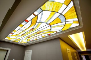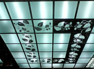 L'idée de gainer le plafond avec des carrés de verre est une sorte de dispositif de plafond à cassette. Le revêtement ne réagit pas au chauffage, aux changements de température et est hypoallergénique. Il peut être construit avec des luminaires contenant des ampoules à incandescence et des éléments LED.