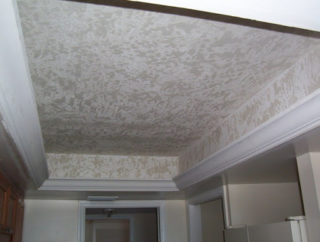 Pour une telle finition, la surface du plafond est nivelée avec du mastic et apprêtée avec des agents pénétrant profondément.
