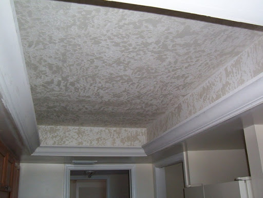 Les plafonds en plaques de plâtre prennent du temps à installer et à faire surface. Ils sont enduits, peints, du papier peint est collé sur la zone. À l'aide de papiers peints liquides, ils créent une surface texturée avec une combinaison originale.