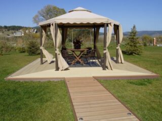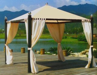 - Gazebos. Structure plus massive. A des murs vierges, peut être équipé de fenêtres, de moustiquaires, de hottes de ventilation. Les connexions sont boulonnées, de sorte que la structure est érigée pendant longtemps, parfois non seulement pour l'été, mais aussi avec la capture de la période hivernale.