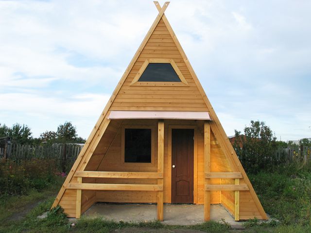 Une autre option budgétaire. La construction de la cabane est simple; les matériaux de construction sont 1,5 à 2 fois moins que pour une maison ordinaire. La forme triangulaire du bâtiment s'intègre dans n'importe quel paysage, la fondation s'impose la plus légère.