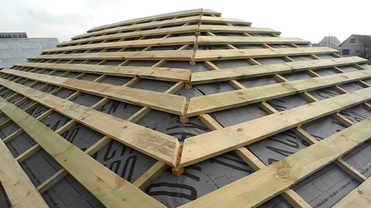 Le lattage est installé - une structure constituée de rails fixés perpendiculairement aux pieds des chevrons. C'est un élément important pour aider à répartir la masse du matériau de toiture. L'étape de construction est déterminée par la marque du profil. Si les pentes sont suffisamment raides (au moins 15 degrés d'angle), la distance sera de 50-100 cm.