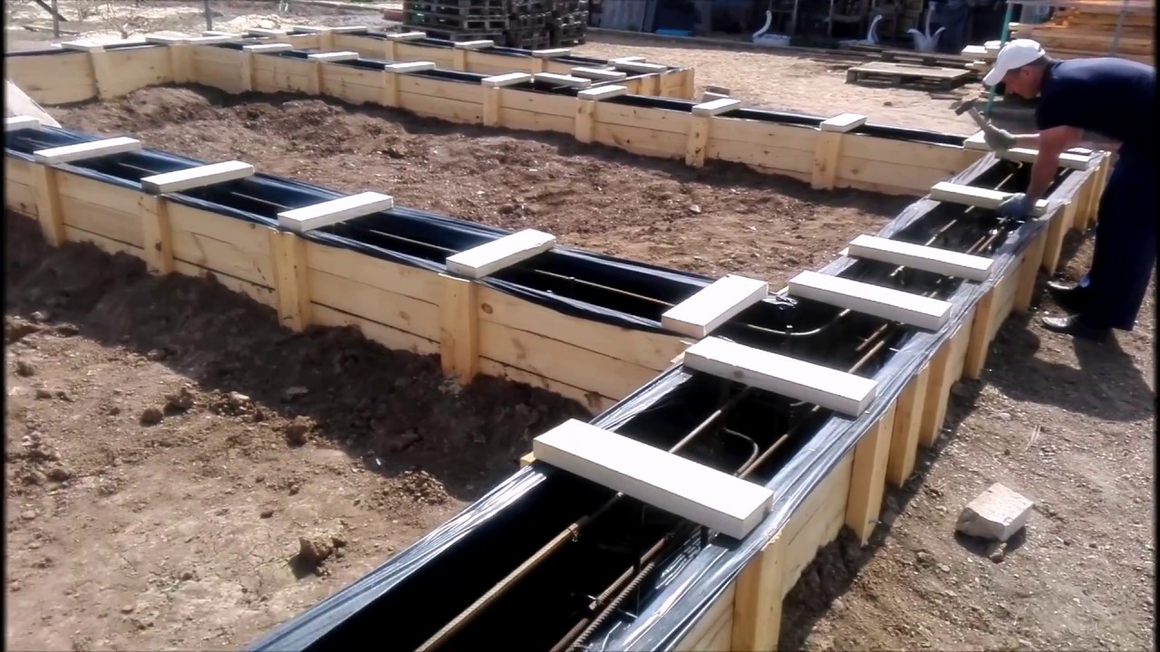 - La tranchée est creusée à la main ou à la pelle, la largeur est choisie en tenant compte de la mise en place du coffrage. Après cela, le fond de la fosse est nivelé pour correspondre à la marque de conception.