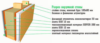 L'épaisseur du mur est choisie en fonction du climat, la destination de la maison est prise en compte (pour résidence temporaire ou permanente). La section transversale est déterminée par les paramètres dimensionnels de deux couches de revêtement, bois, couche d'isolation.