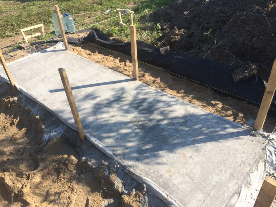 Le béton est coulé en continu, s'ils font une pause, laissez un joint incliné. Après le coulage, le béton est recouvert de polyéthylène.