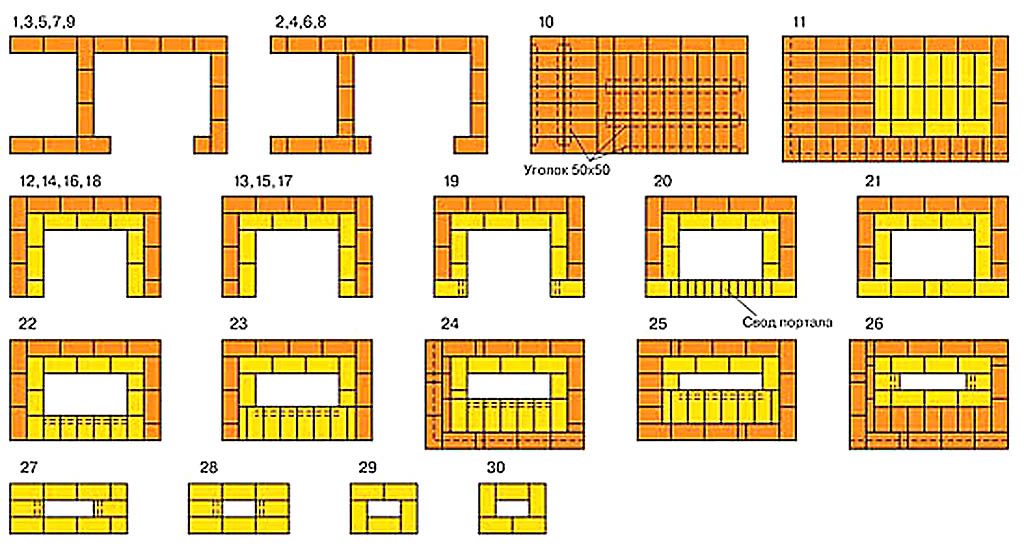 Des commandes de maçonnerie sont utilisées, dans lesquelles la disposition des briques dans chaque rangée suivante est indiquée. La fumée doit être introduite dans la cheminée après avoir emprunté des passages spéciaux. Si les conduits intérieurs sont mal pliés, il n'y aura pas de courant d'air ou de la fumée sortira de la chambre de combustion.