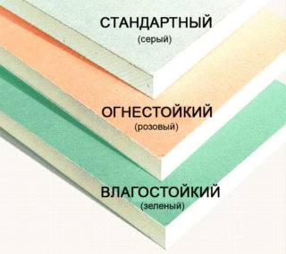 Les cloisons sèches sont divisées en 3 types, qui se distinguent par leur couleur. Le beige indique des feuilles de qualité normale, le papier vert sur la surface indique la résistance à l'humidité du matériau et le gris indique la résistance au feu. Dans la salle de bain, le plafond est mieux fait avec des plaques de plâtre vertes. Le beige se décomposera lorsqu'il sera humidifié.