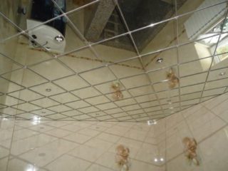 Dans la salle de bain, de vrais miroirs peuvent être montés au plafond. Le matériau de construction est cher; les miroirs nécessitent un système de montage spécial et un cadre renforcé, car le revêtement pèse beaucoup. Des trous sont percés dans chaque carreau, ce qui ne peut être fait que dans un atelier spécial.