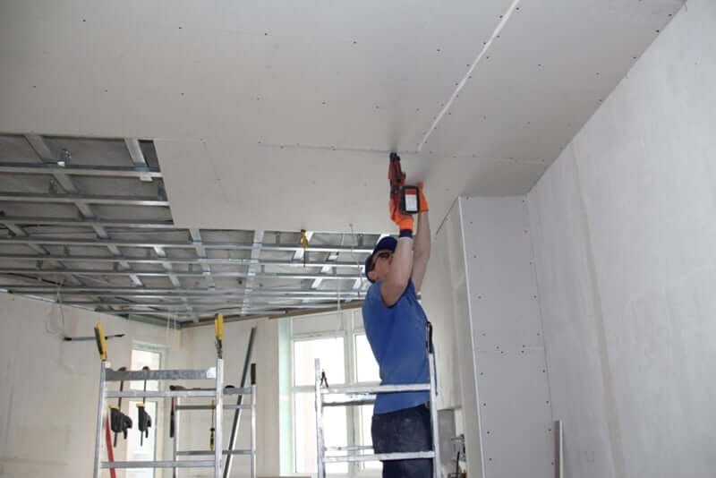 Le plafond en panneaux de fibres de gypse est mastic, apprêté et peint avec une peinture à base d'eau. Des dispositifs d'éclairage sont installés dans la structure. Les fils sont cachés dans des tubes isolants ondulés.