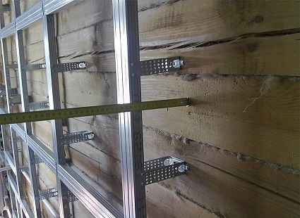 - Les lattes des lattes sont fixées aux supports avec des boulons. Le lattage est effectué immédiatement sur l'ensemble du mur afin d'arracher l'ensemble de la structure dans son ensemble.