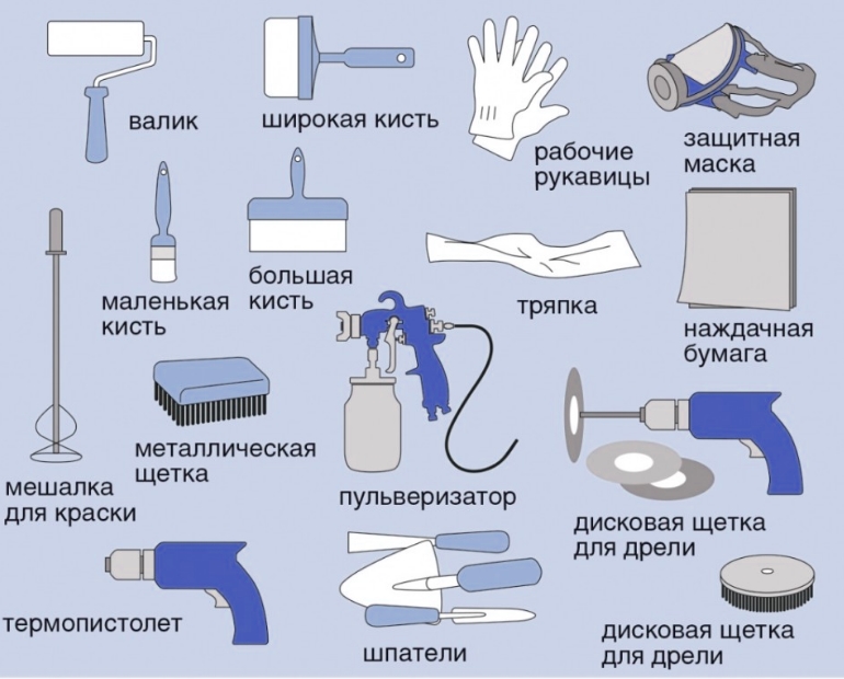 - rouleau, brosses, pistolet de pulvérisation, pistolet de pulvérisation.