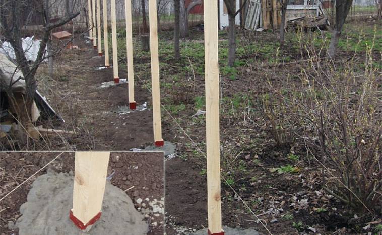 Lorsque les supports sont fixés, les éléments transversaux du cadre y sont cloués aux repères 1/3 et 2/3 de la longueur des piquets. Un autre décalage peut être renforcé entre eux. Cela est particulièrement vrai dans les régions où les rafales de vent sont fréquentes. Ensuite, les piquets peuvent être montés sur le cadre.